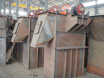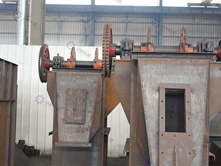 斗式提升機的牽引構(gòu)件有環(huán)鏈、板鏈和膠帶等幾種。環(huán)鏈的結(jié)構(gòu)和制造比較簡單,與料斗的連接也很牢固,輸送磨琢性大的物料時,鏈條的磨損較小,但其自重較大。板鏈結(jié)構(gòu)比較牢固,自重較輕,適用于提升量大的提升機,但鉸接接頭易被磨損,膠帶的結(jié)構(gòu)比較簡單,但不適宜輸送磨琢性大的物料,普通膠帶物料溫度不超過60°C,夾鋼繩膠帶允許物料溫度達(dá)80°C,耐熱膠帶允許物料溫度達(dá)120°C,環(huán)鏈、板鏈輸送物料的溫度可達(dá)250°C。