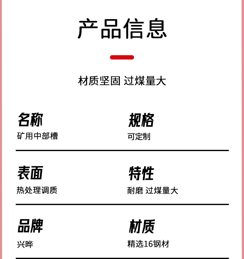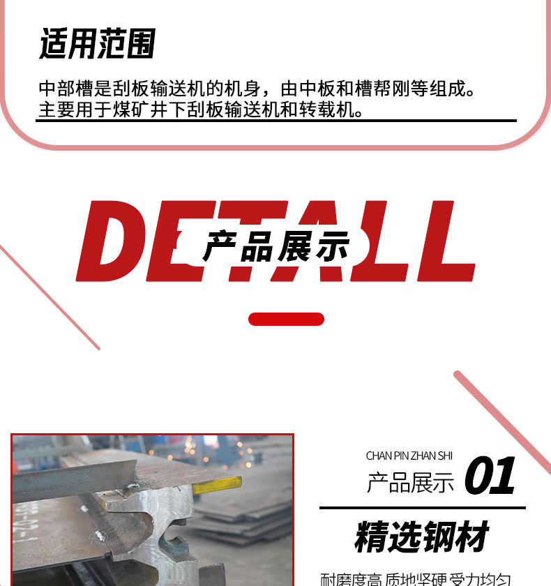 重型中部槽是刮板輸送機的關鍵組成部分,?主要用于煤礦井下刮板輸送機和轉載機。?它由中板和槽幫剛等組成,?其中上槽用于運煤,?下槽供刮板鏈返程用。?重型中部槽的設計和制造旨在滿足大功率、?大采高重型刮板輸送機的配套需求,?確保其在惡劣的煤礦環(huán)境下能夠穩(wěn)定、?高效地運行。?